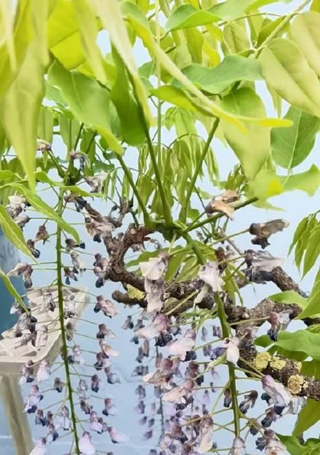 修剪侧枝是为了让紫藤花更好地向外延伸,从而营造出更加丰盛的花朵。